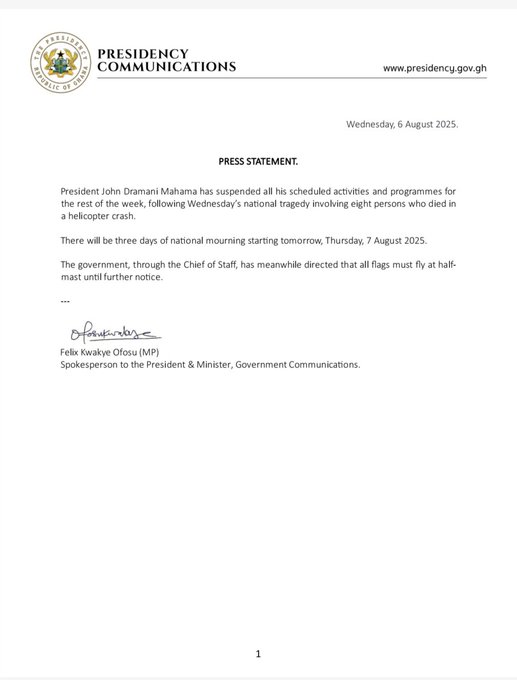 President John Mahama has declared three days of national mourning beginning Thursday, August 7, in honour of the eight Ghanaians who lost their lives in a tragic military helicopter crash today.